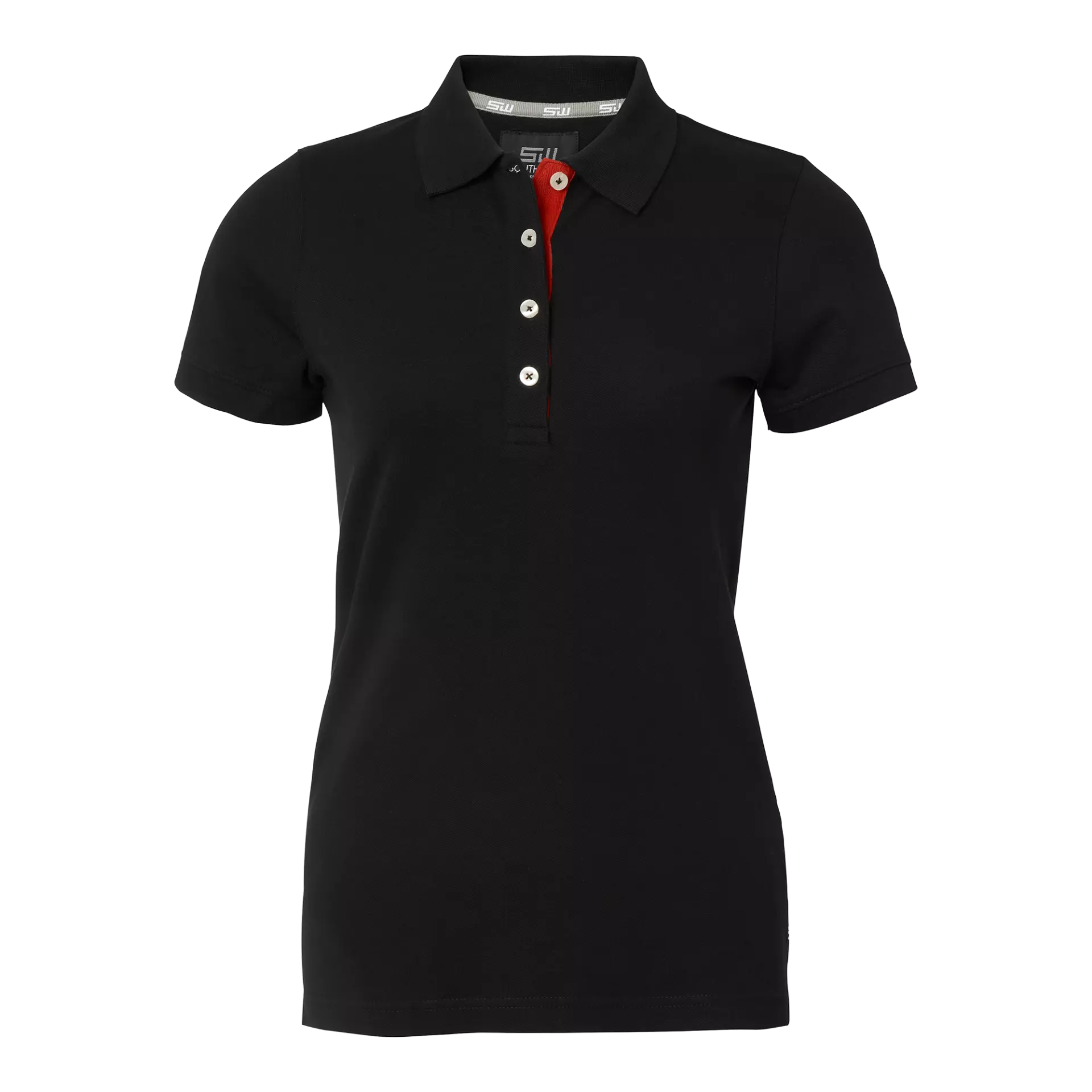This women's polo shirt features a stretch cotton pique construction with slim fit design, combining comfort and professional appearance. The garment incorporates decorative elements including ribbon and half-moon stitching at the neck, along with a longer button placket featuring white buttons and herringbone interior detailing. OEKO-Tex certified materials ensure quality and safety standards for workplace and casual wear applications.