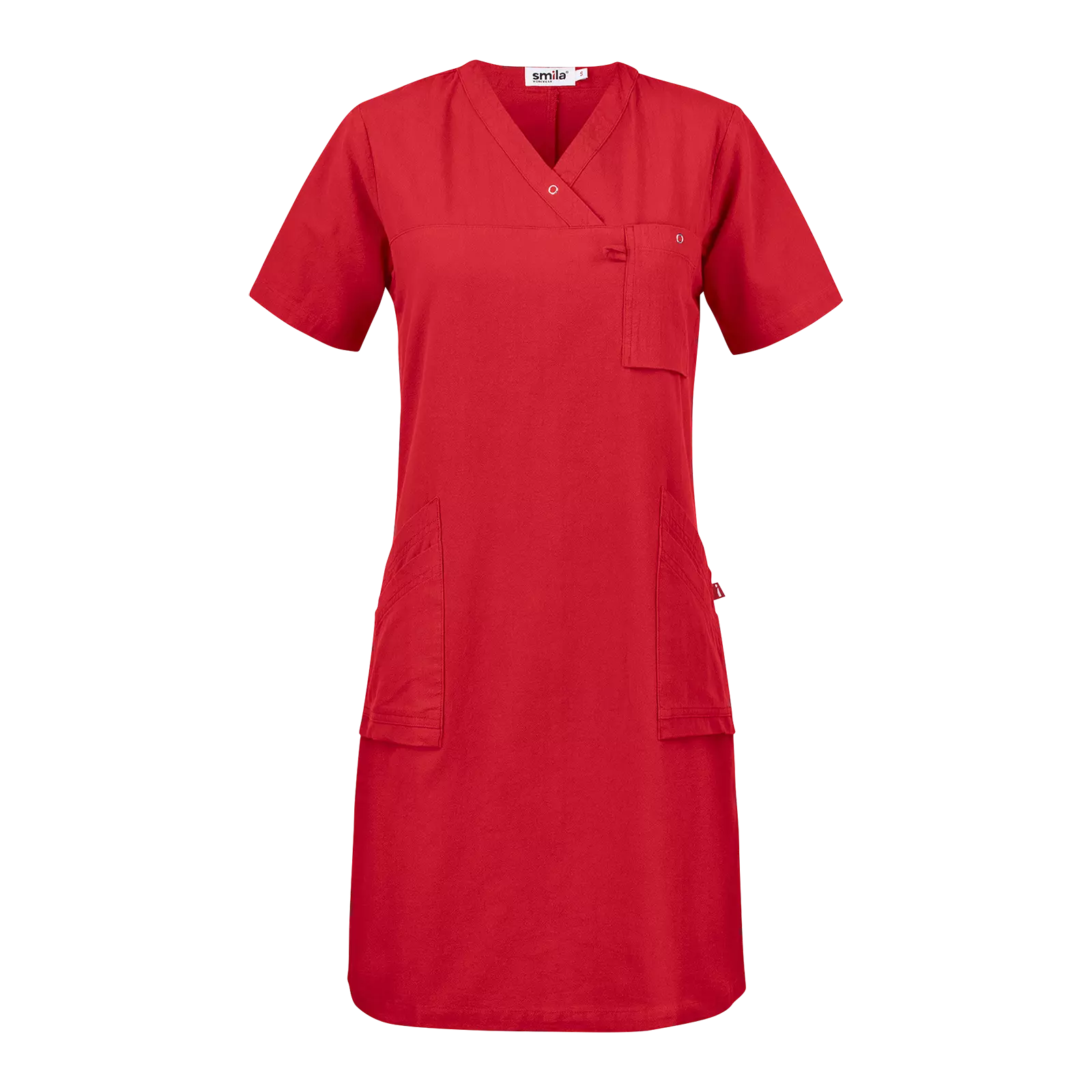 This lightweight wrap dress features a V-neckline and crinkled cotton construction, designed specifically for women in the healthcare sector. The dress combines functionality with a slightly fitted cut, offering spacious front pockets with integrated key holder and cell phone storage, plus a chest pocket with ring snap and card holder for easy access to ID cards. With side slits for enhanced mobility and OEKO-Tex certification, this garment provides reliable performance for demanding work environments.