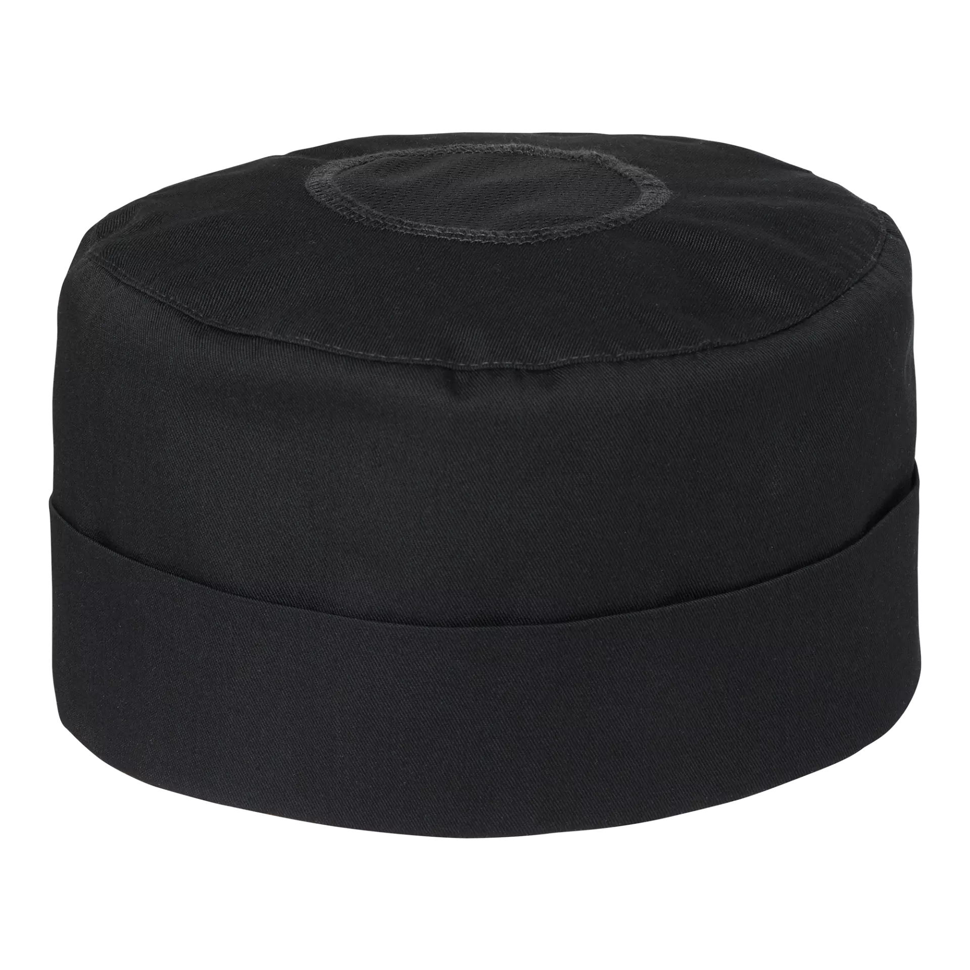 This chef's hat combines sustainable materials with practical design features for professional kitchen environments. The hat incorporates mesh ventilation at the top and includes a foldable brim with Velcro adjustment strap for customizable fit and comfort during extended wear.