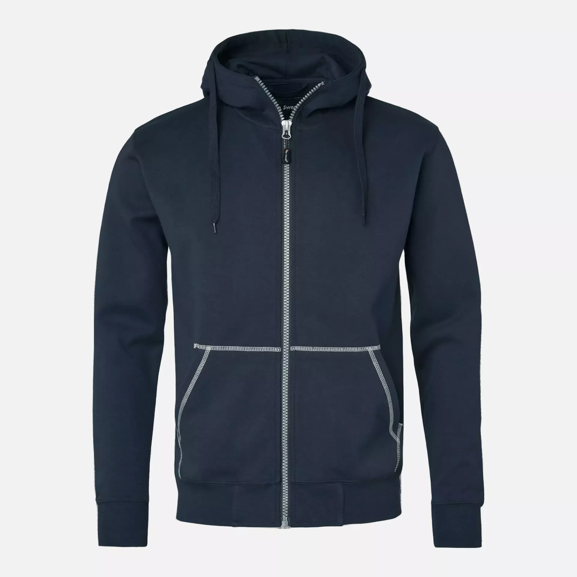 This hooded sweatshirt features a full zipper construction with 80% cotton and 20% polyester blend, weighing 330 g/m². The garment includes practical elements such as an adjustable drawstring hood, two front pockets for tool storage, and ribbed cuffs and hem for secure fit. OEKO-Tex certified and designed for durability in demanding work environments.