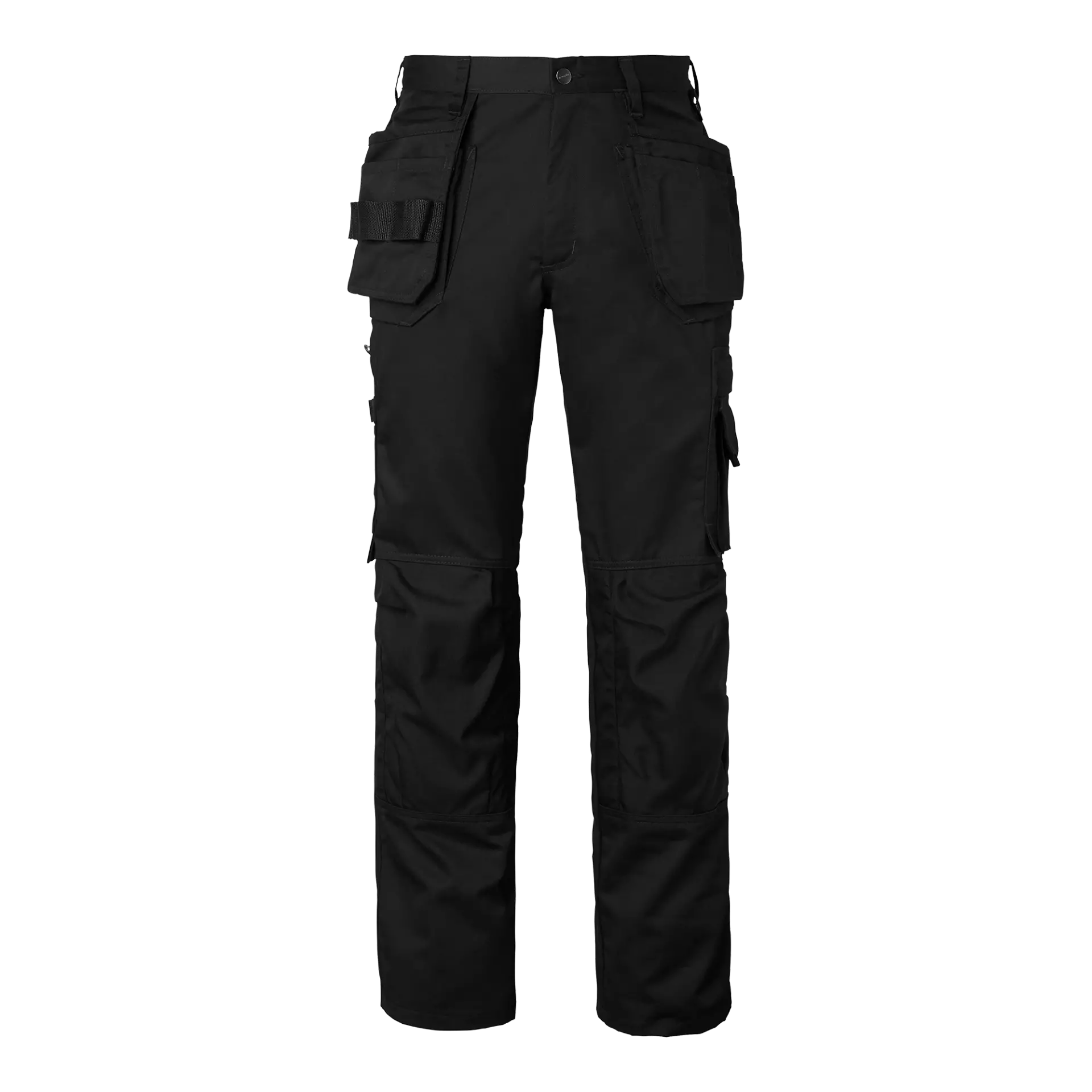 Professional craftsman trousers featuring pre-curved legs and CORDURA® knee pockets designed for construction and industrial work environments. These trousers offer extensive pocket configurations and reinforcements for enhanced durability and functionality. The robust polyester-cotton blend construction with 300g/m² fabric weight ensures long-lasting performance in demanding workplace conditions.