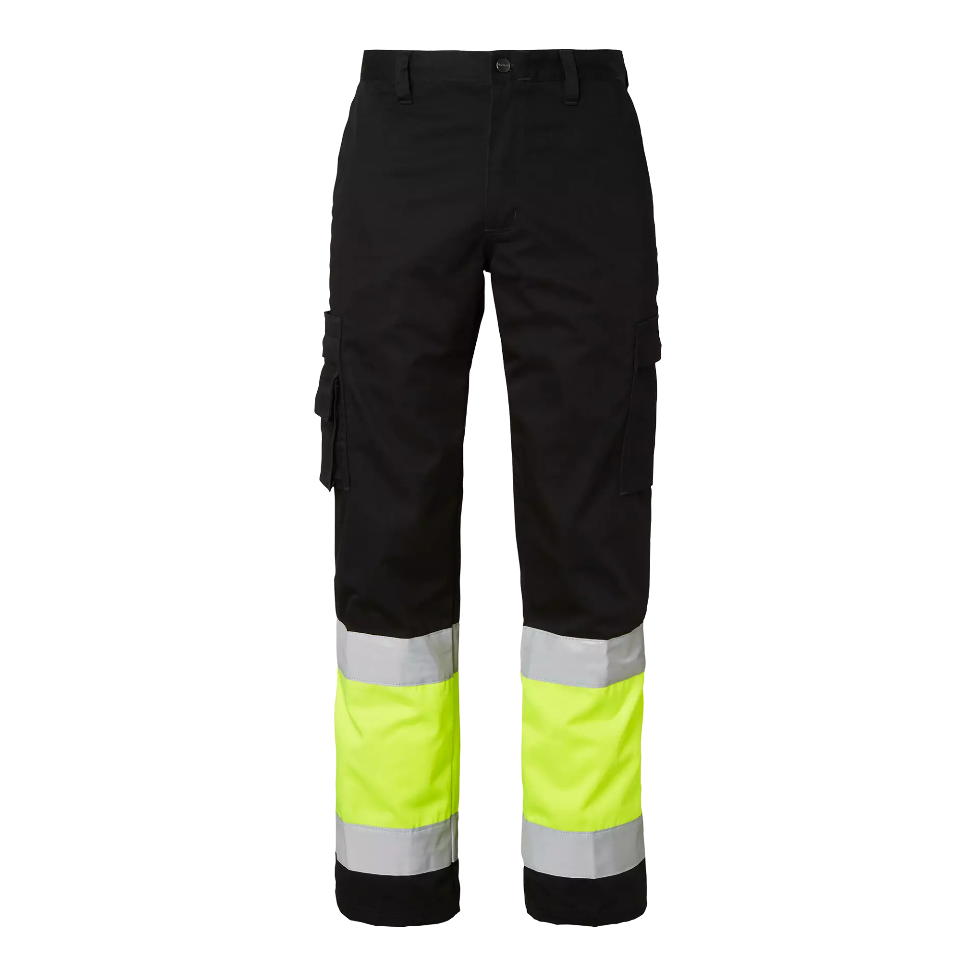 Professional service trousers designed for construction and industrial applications, featuring comprehensive pocket organization and high-visibility classification. These waist trousers combine a durable 65% polyester and 35% cotton blend with reinforced construction for demanding work environments. The garment meets EN ISO 20471 Class 1 standards for high visibility and carries OEKO-Tex SE 23-308 certification.