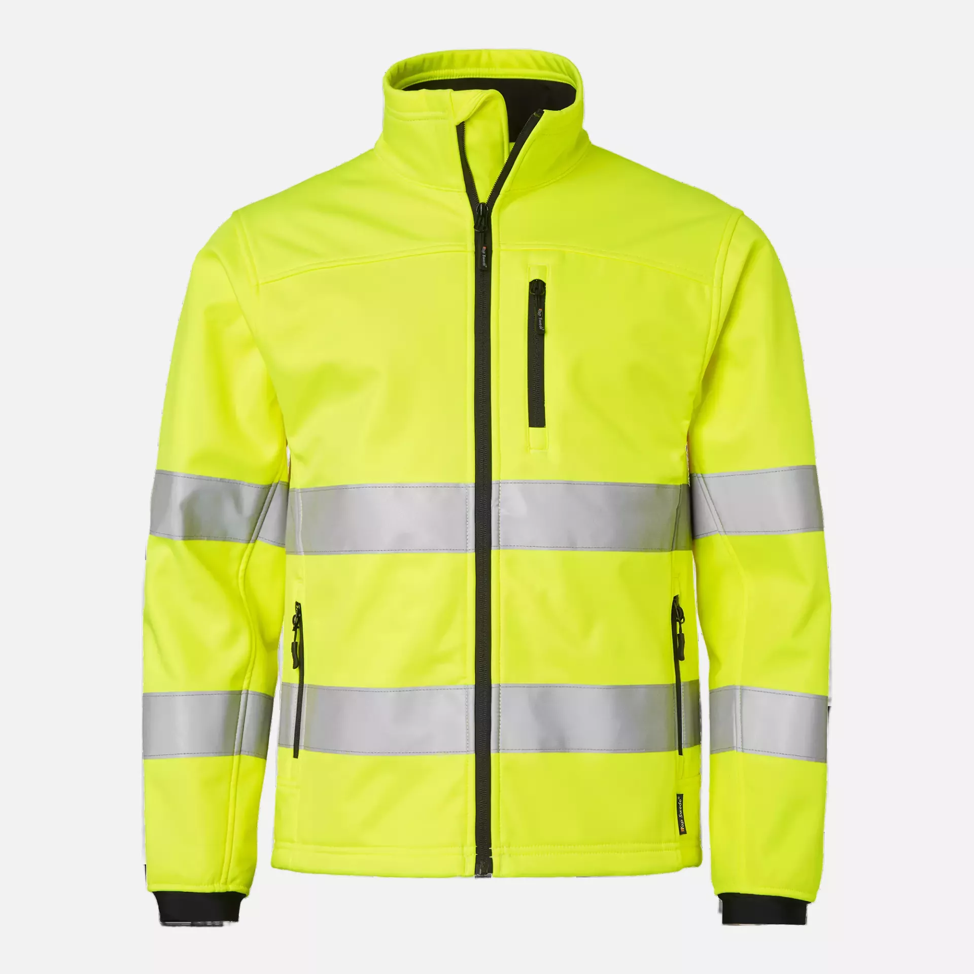 This high-visibility softshell jacket features 3-layer laminated construction with windproof and water-repellent properties, complemented by warming fleece lining for optimal protection and comfort. The jacket includes practical storage solutions with one chest pocket and two front zippered pockets, all secured with full zipper closure and chain guard. Meeting EN ISO 20471 Class 3 standards with 8,000mm water resistance, it provides reliable performance for construction and industrial professionals in demanding work environments.