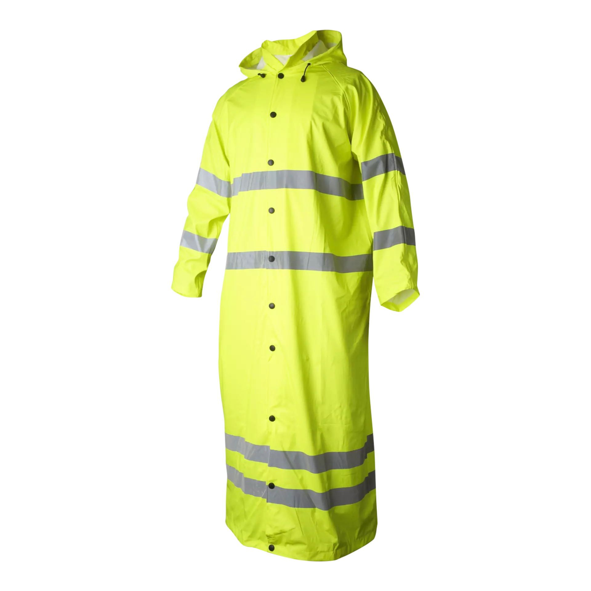 This full-length raincoat features smooth stretch fabric with welded seams for complete waterproofness and durability in demanding work environments. The coat can be buttoned to an overall for extra protection, making it ideal for construction and industrial professionals working in rainy conditions. With high visibility properties and a hood for comprehensive coverage, this rainwear provides reliable protection against rain and adverse weather.