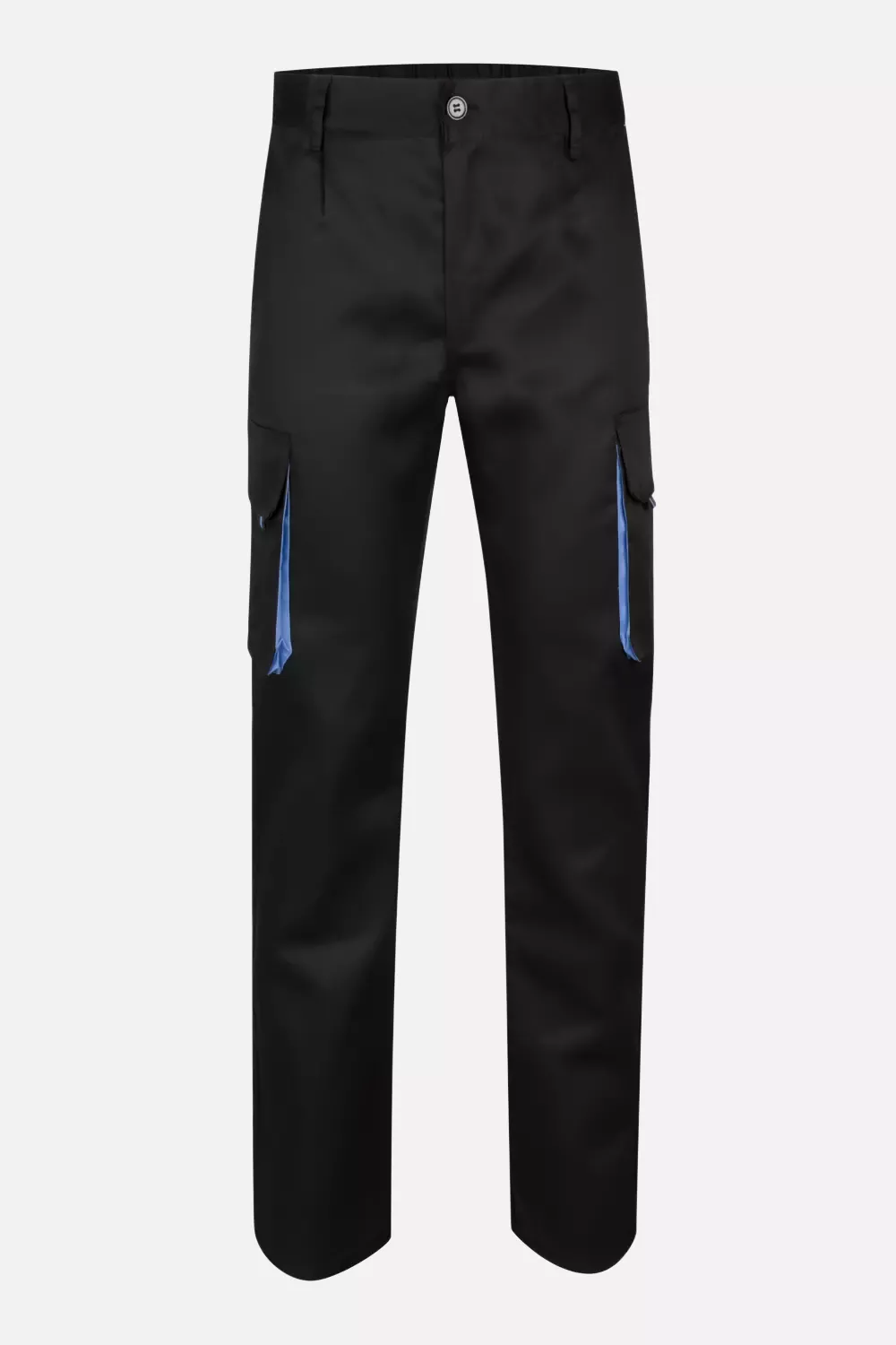 Professional work trousers featuring a twill fabric construction with reinforced design elements for enhanced durability. The garment includes six strategically placed pockets with secure closures and an elastic waistband for comfort during extended wear.