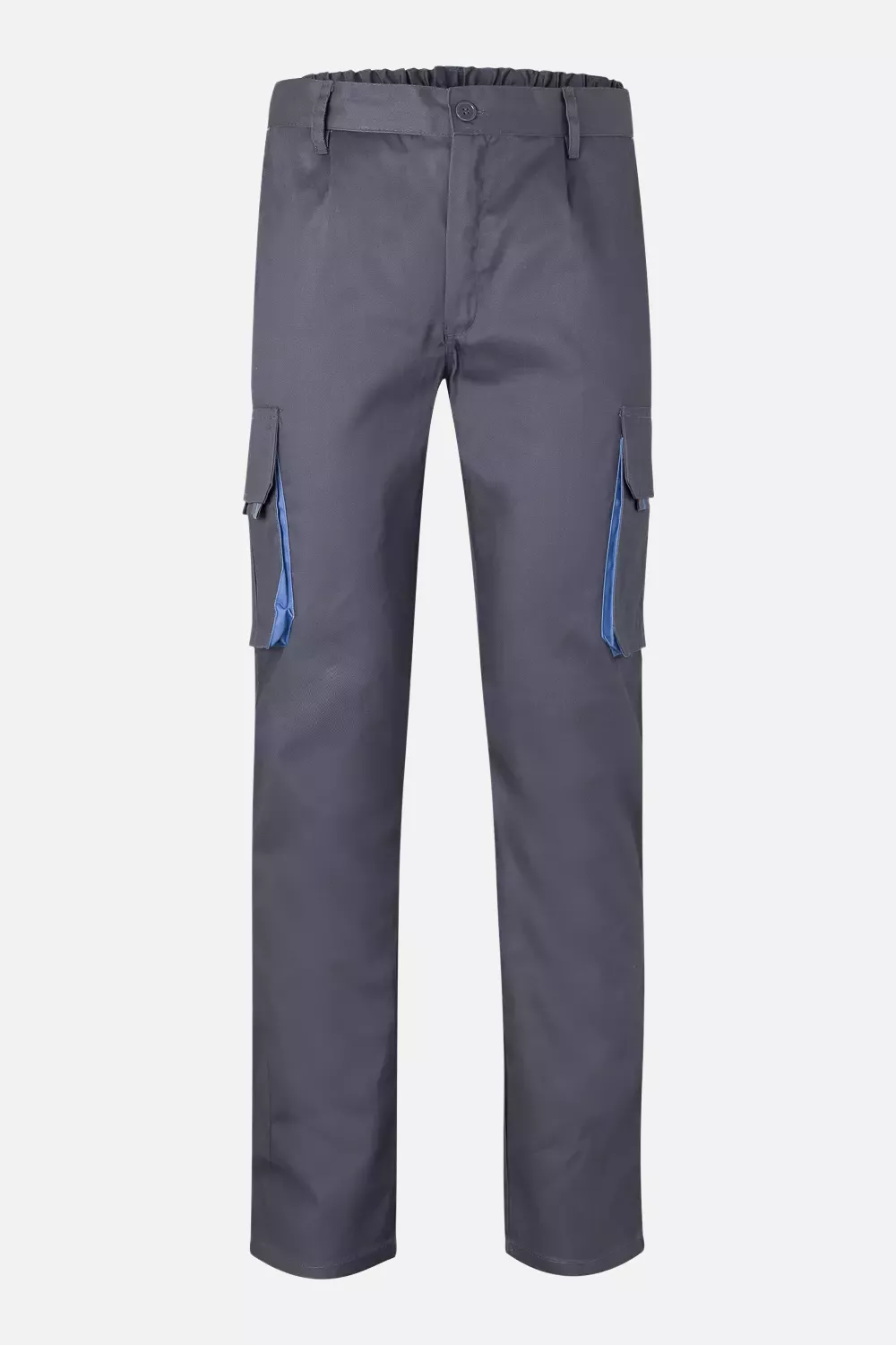 Professional work trousers featuring a twill fabric construction with reinforced design elements for enhanced durability. The garment includes six strategically placed pockets with secure closures and an elastic waistband for comfort during extended wear.