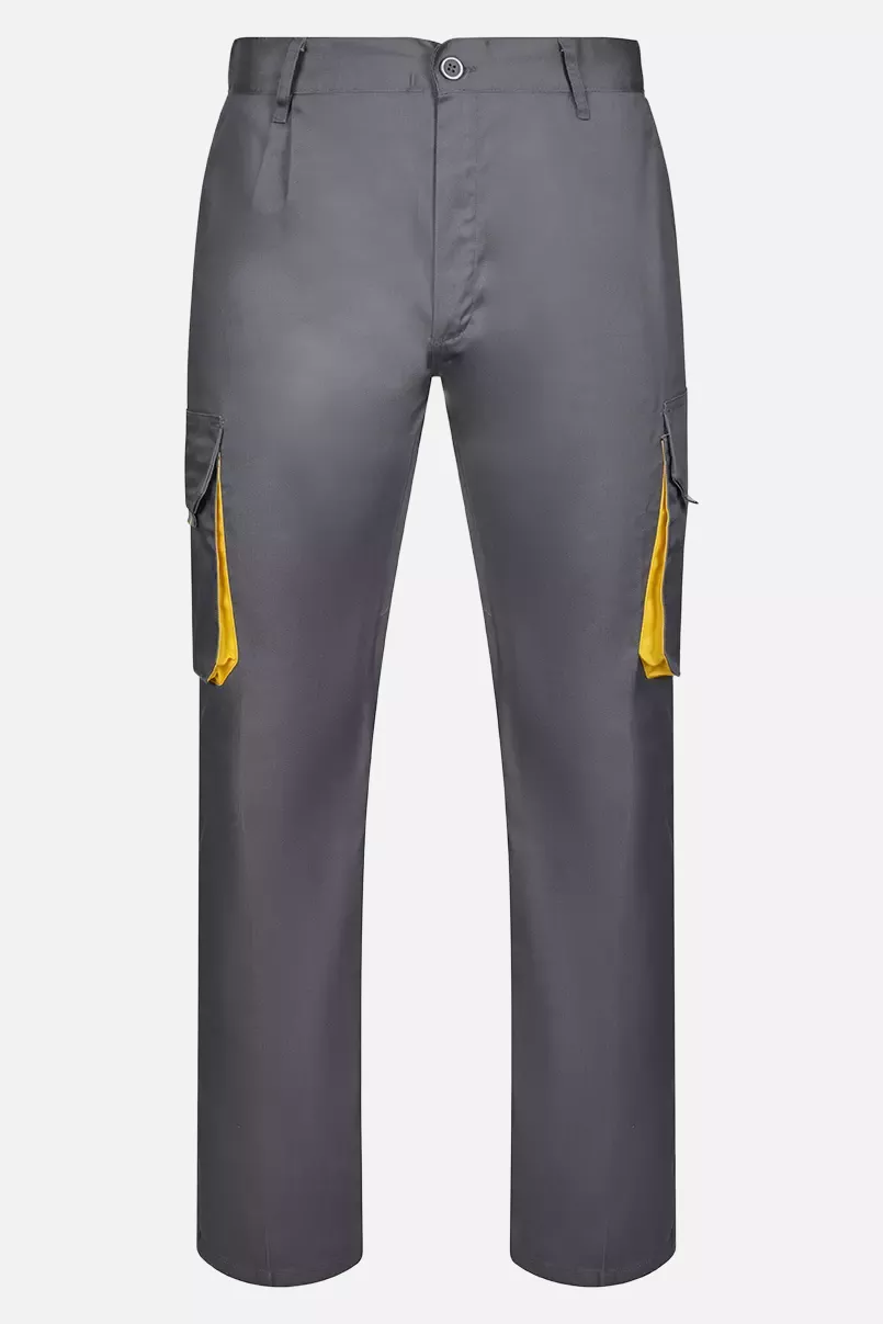 Professional work trousers featuring a twill fabric construction with reinforced design elements for enhanced durability. The garment includes six strategically placed pockets with secure closures and an elastic waistband for comfort during extended wear.