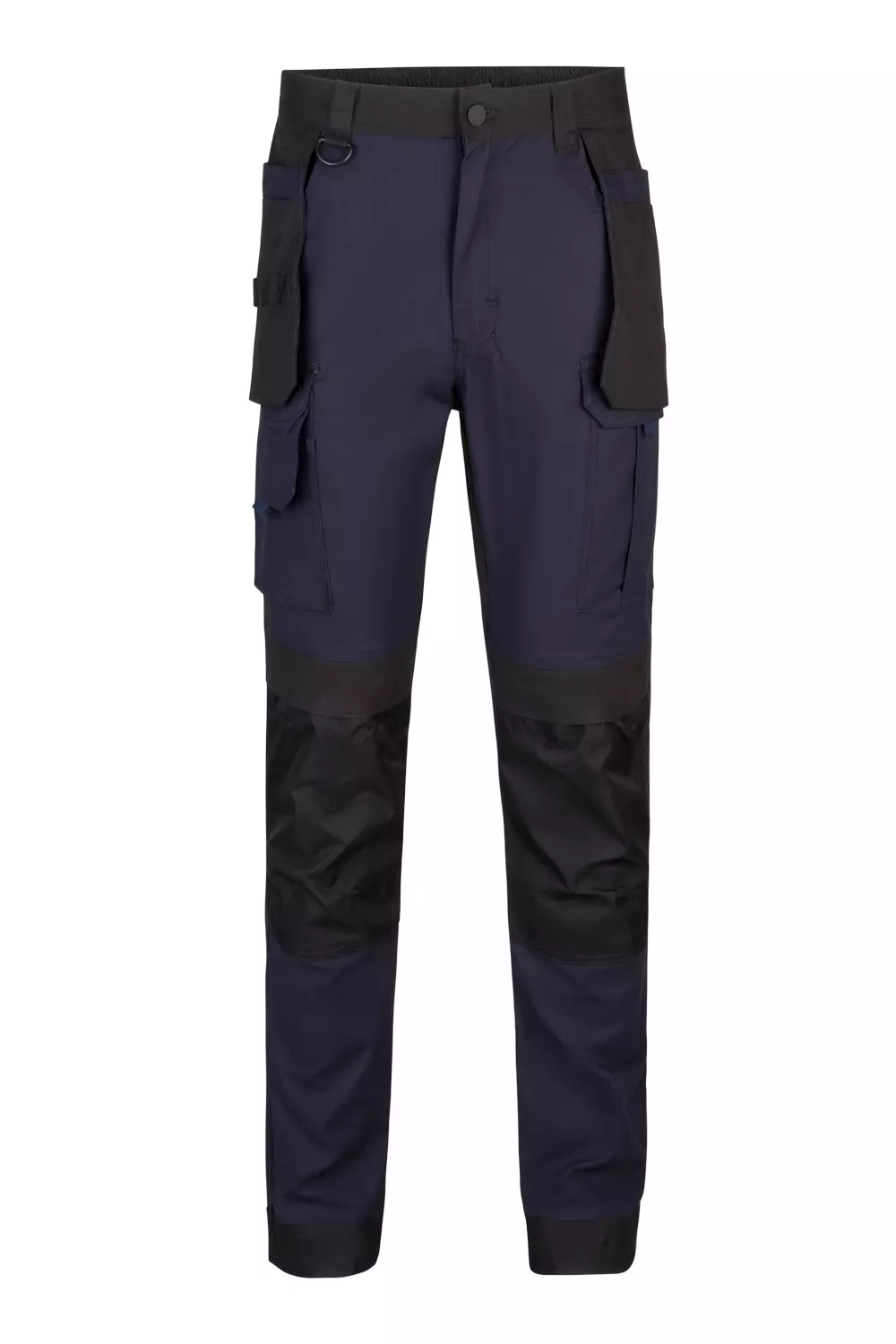 Professional work trousers featuring comprehensive reinforcement and multiple storage solutions for demanding work environments. The garments combine stretch canvas fabric with strategic reinforcements at high-wear areas including knees, lower legs, and back panels. With ten pockets total, including specialized holster pockets and a knee pad compartment, these trousers provide extensive functionality for tool and equipment storage.