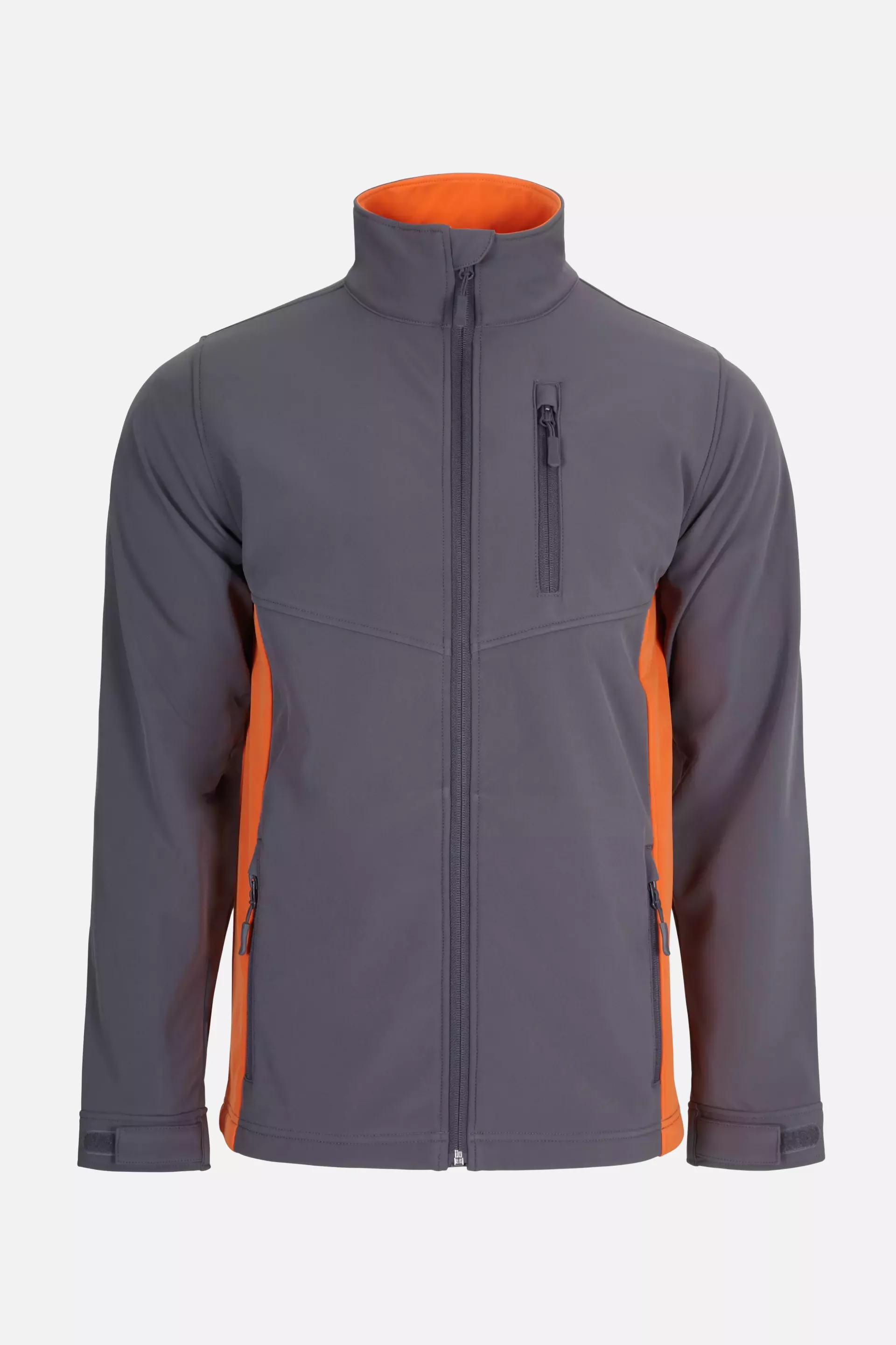This soft shell garment features a three-ply fabric construction with 94% polyester and 6% elastane for flexibility and durability. The design includes a central inverted zip with protective placket, contrast color detailing on sides and inner collar, and decorative stitching on chest and back yoke. With five strategically placed pockets and adjustable velcro cuffs, this garment combines functionality with professional appearance.