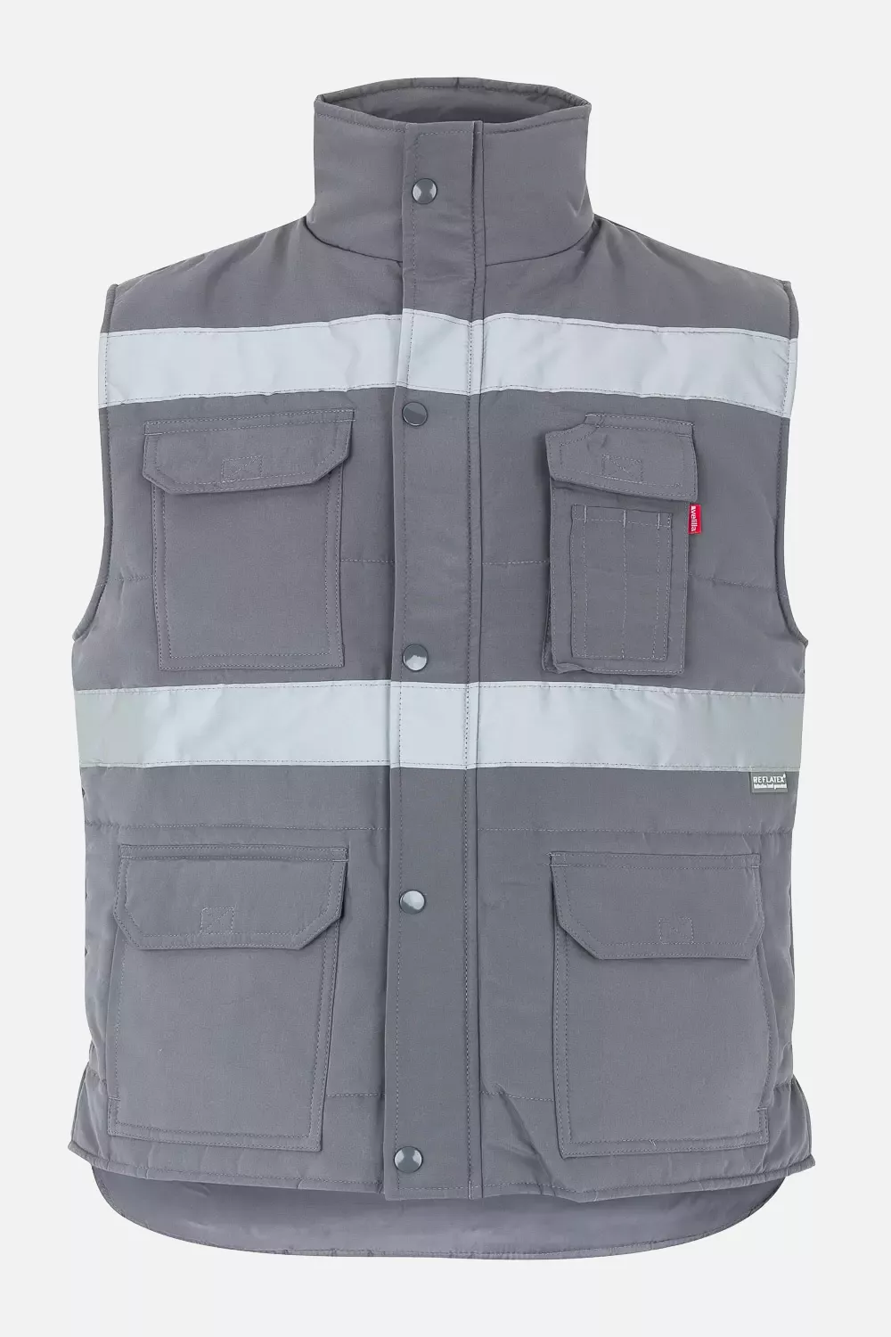 This multi-pocket work jacket features a concealed central zip with protective flap and snap button closure, enhanced with reflective tape on the torso for visibility. The garment includes a side elastic waistband and windbreaker construction around the armhole for improved fit and weather protection. With seven strategically placed pockets including chest, lower, and interior storage options, this jacket provides comprehensive organization for tools and personal items.