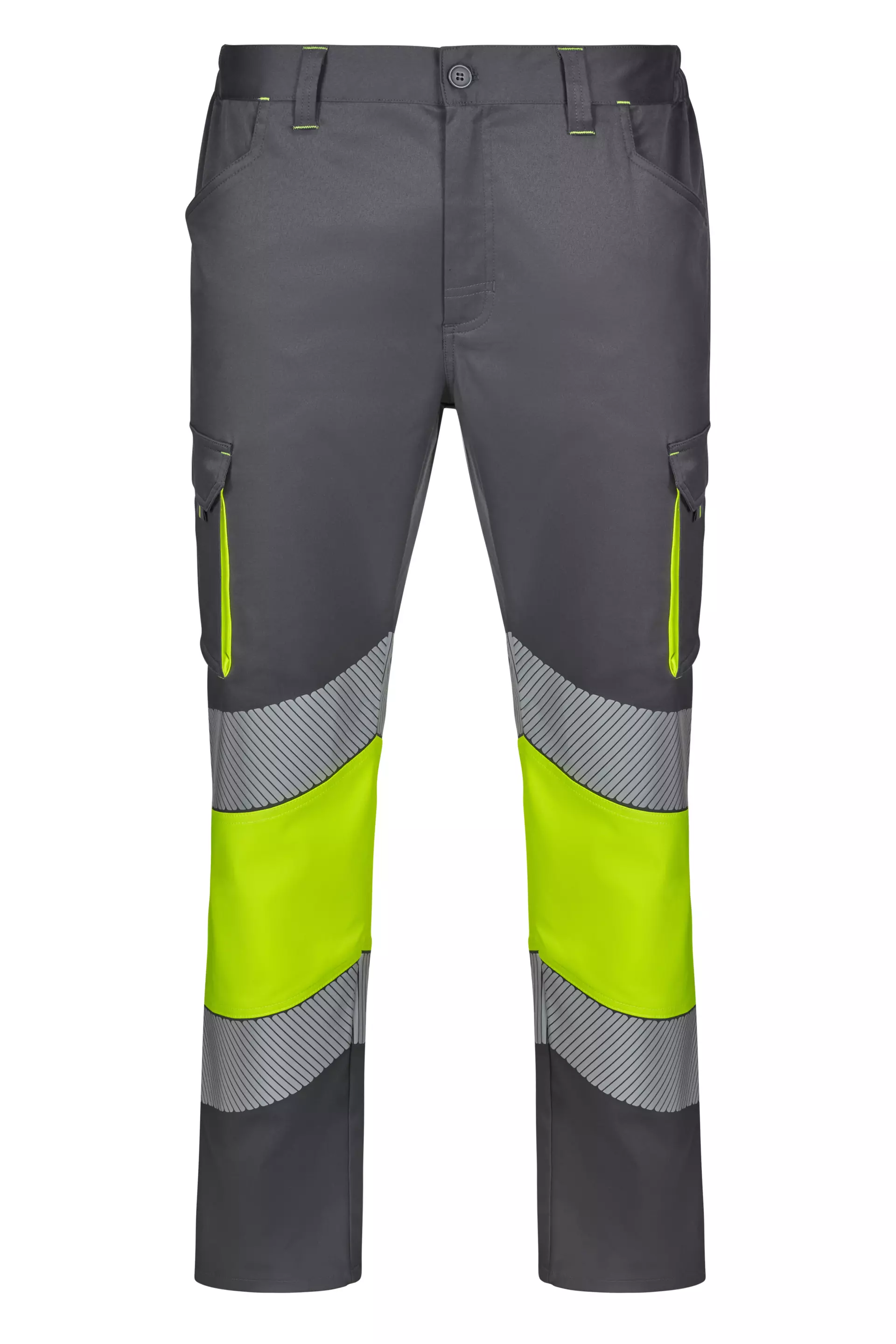 These stretch work trousers feature heat-sealed reflective tape on the lower legs for enhanced visibility and safety. The garment combines durability with flexibility through its polyester-cotton-elastane blend and reinforced construction. With six strategically placed pockets and contrast detailing, these trousers offer both functionality and professional appearance for demanding work environments.