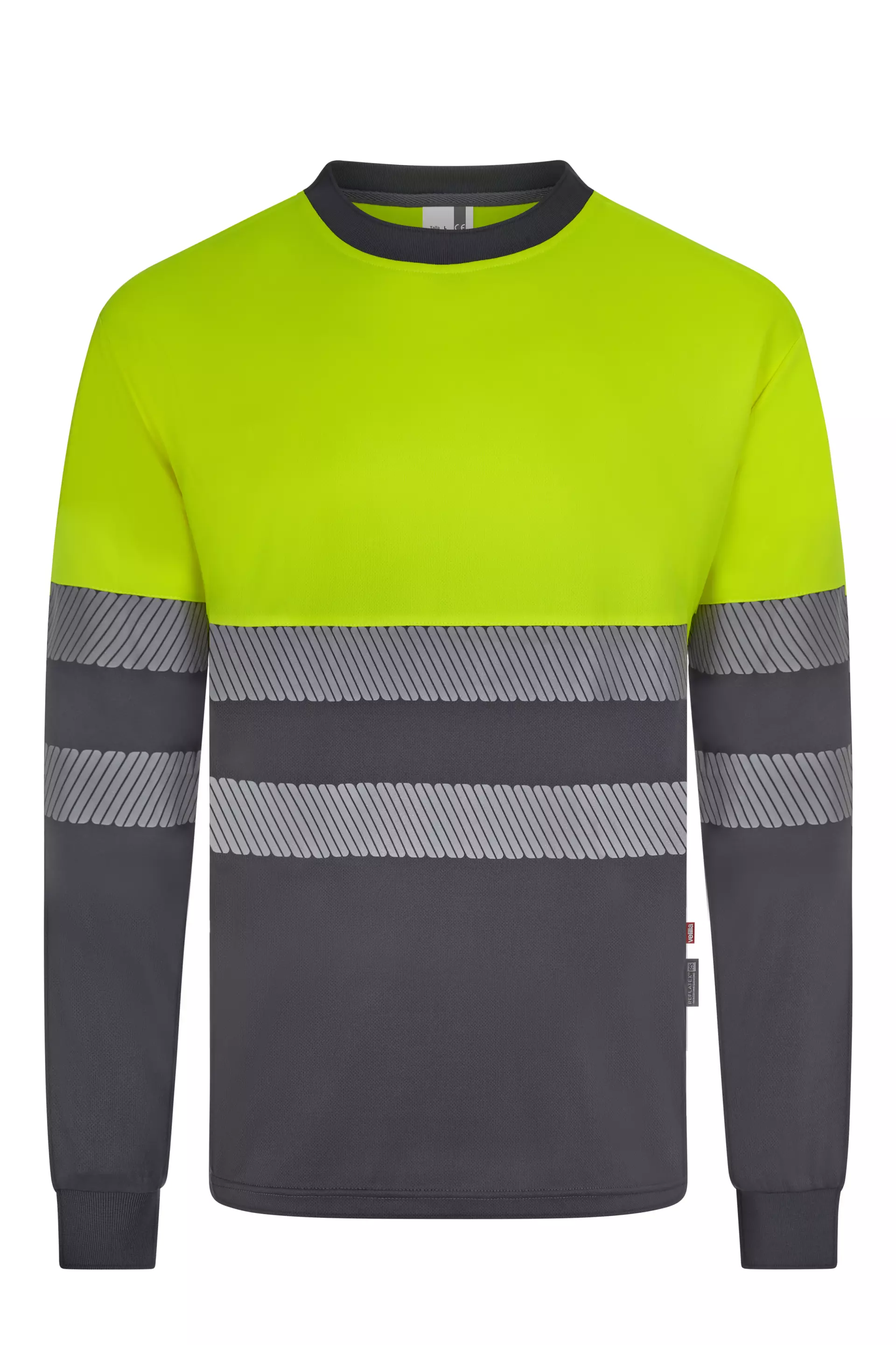 This high-visibility garment features heat-sealed segmented reflective tape on the torso and sleeves for enhanced visibility. Constructed from 100% recycled polyester in a micro bird-eye weave, it includes a contrasting color ribbed round neck with herringbone neck tape and ribbed cuffs for durability and comfort.