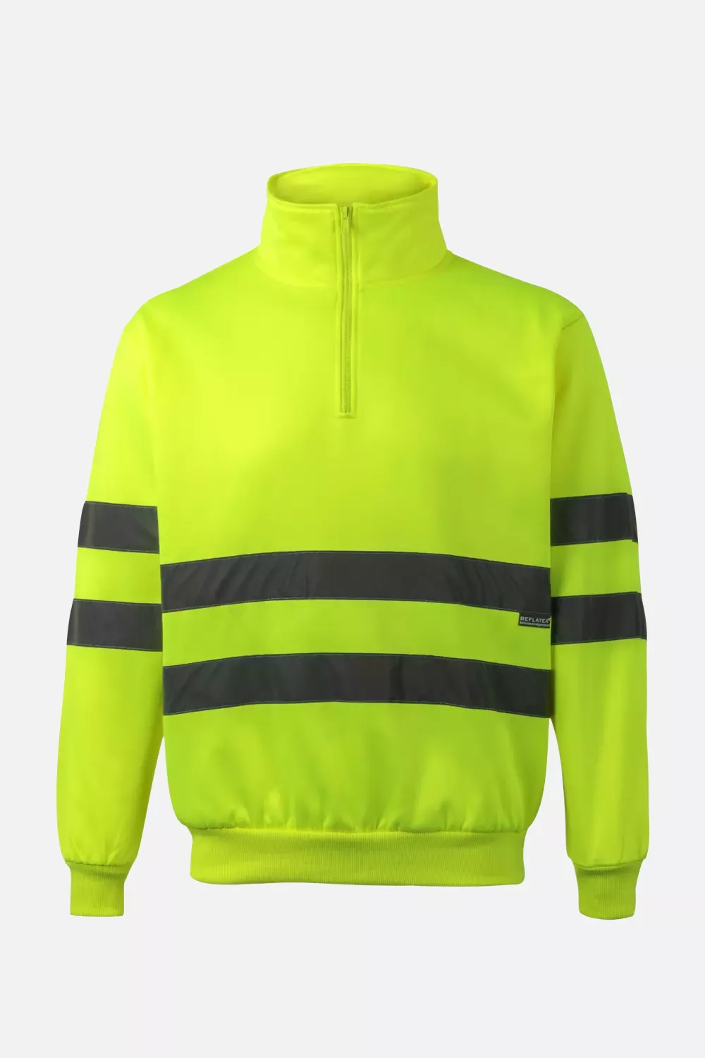This half-zip turtleneck sweatshirt features reflective tape on the torso and sleeves for enhanced visibility. Constructed from 100% polyester knitted plush fabric, it includes ribbed cuffs and waistband for a secure fit and comfort during wear.