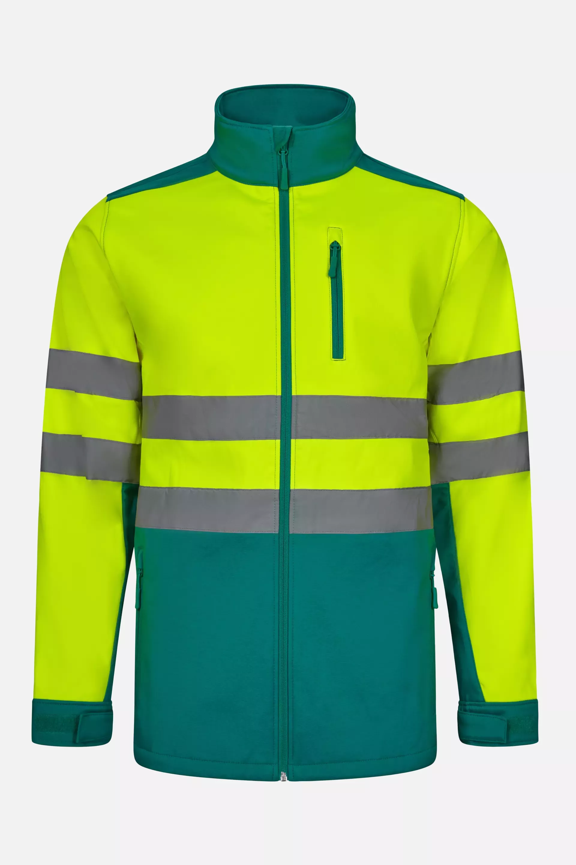 This soft shell garment features a three-ply fabric construction with 96% polyester and 4% elastane for flexibility and durability. The design includes reflective tape on torso and sleeves for visibility, along with multiple storage options through five strategically placed pockets. Practical elements like adjustable velcro cuffs and inverted zippers provide enhanced functionality and weather protection.