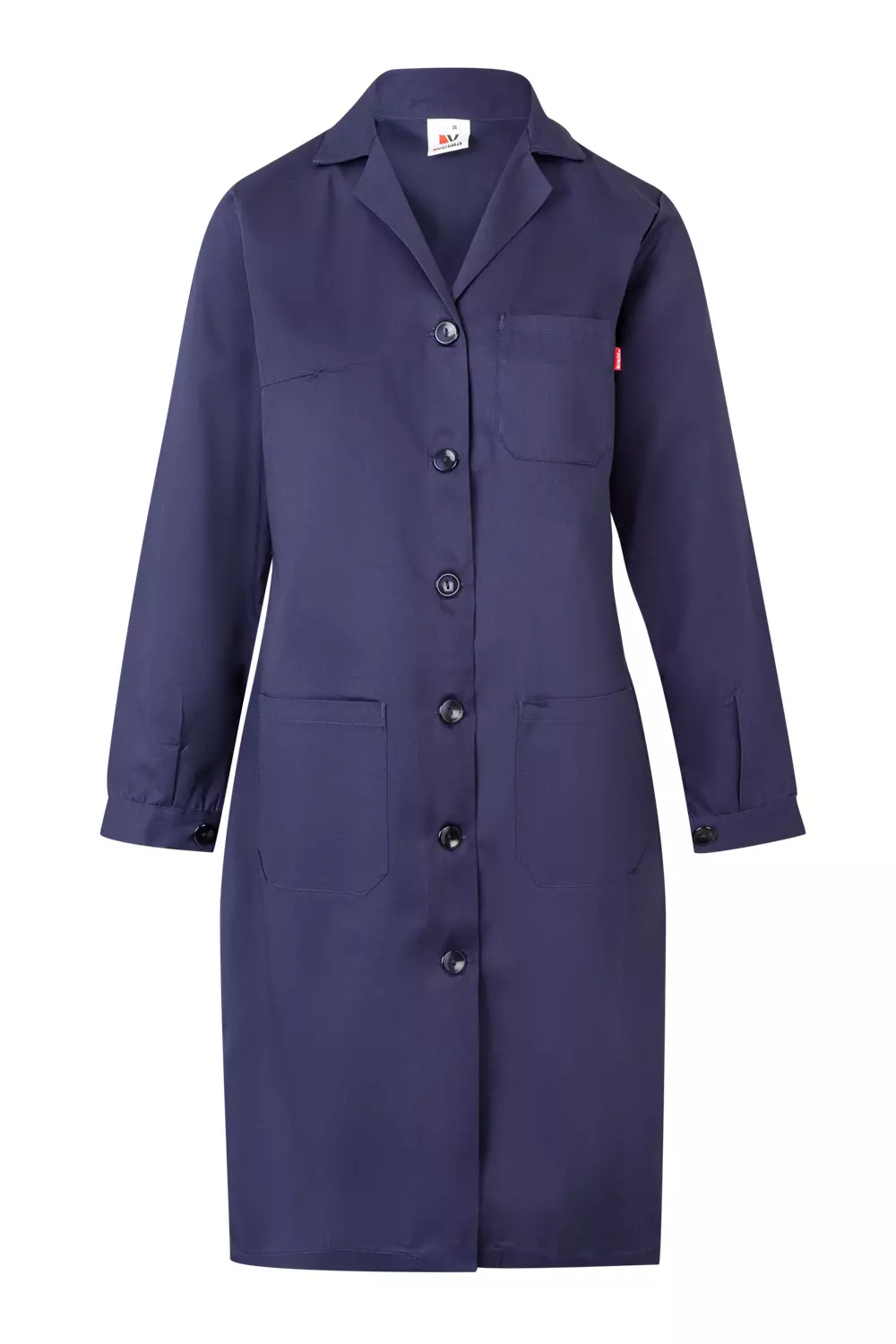 This twill garment features a practical design with front button closure and rear belt for adjustable fit. The durable polyester-cotton blend construction provides reliable performance, while three patch pockets offer convenient storage solutions.
