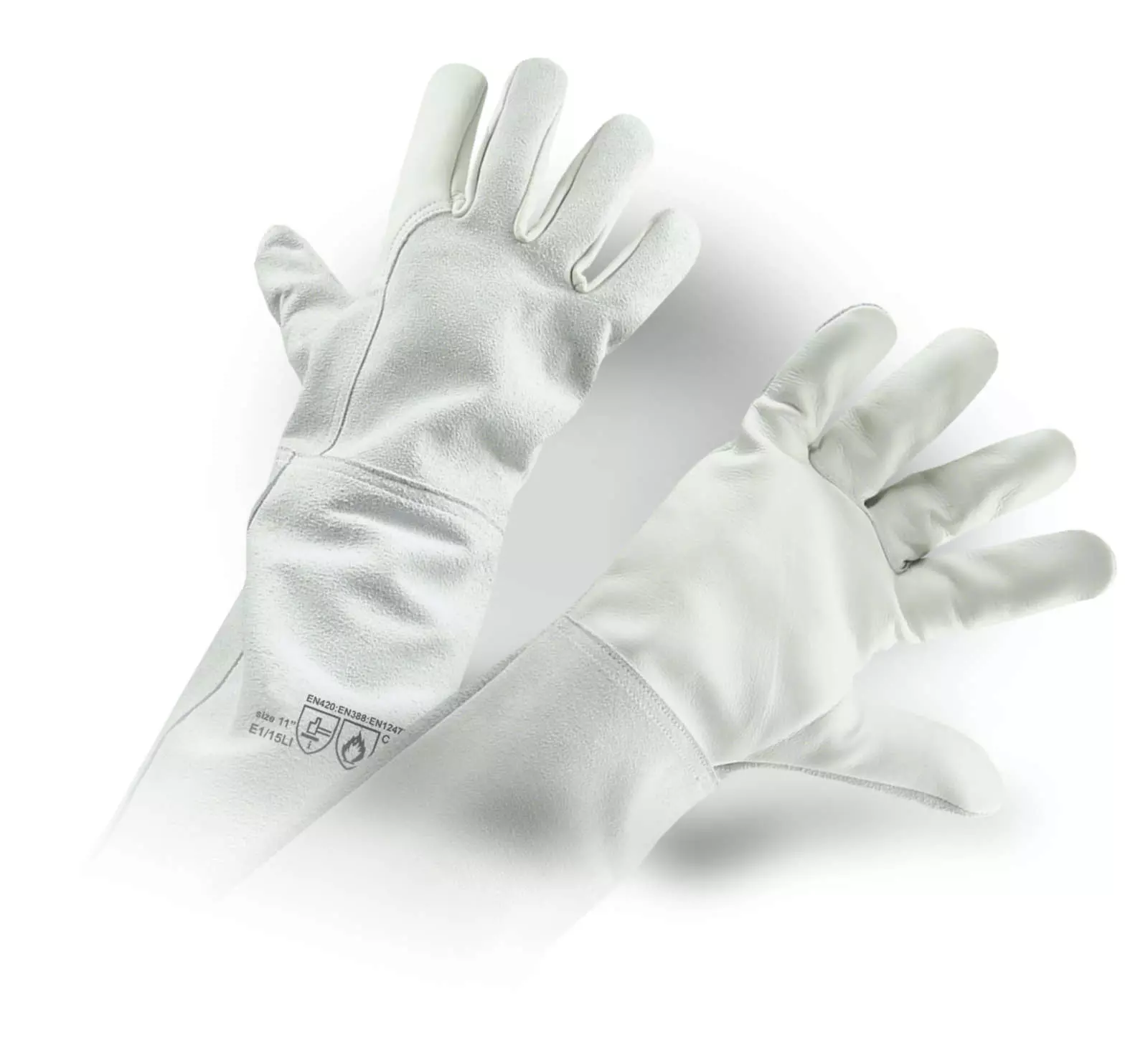 protective welding gloves - leather, palm side from assorted sheep skin, 20 cm length, hard cuff made of split leather, kevlar stitching, without lining