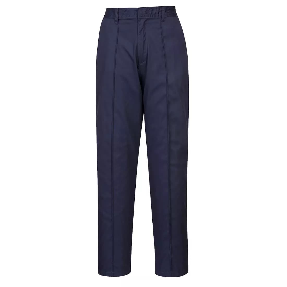 Professional women's work trousers constructed with durable Kingsmill polycotton fabric for high performance and comfort. The half-elasticated waist design provides unrestricted movement while maintaining a tailored appearance with sewn-in creases an...