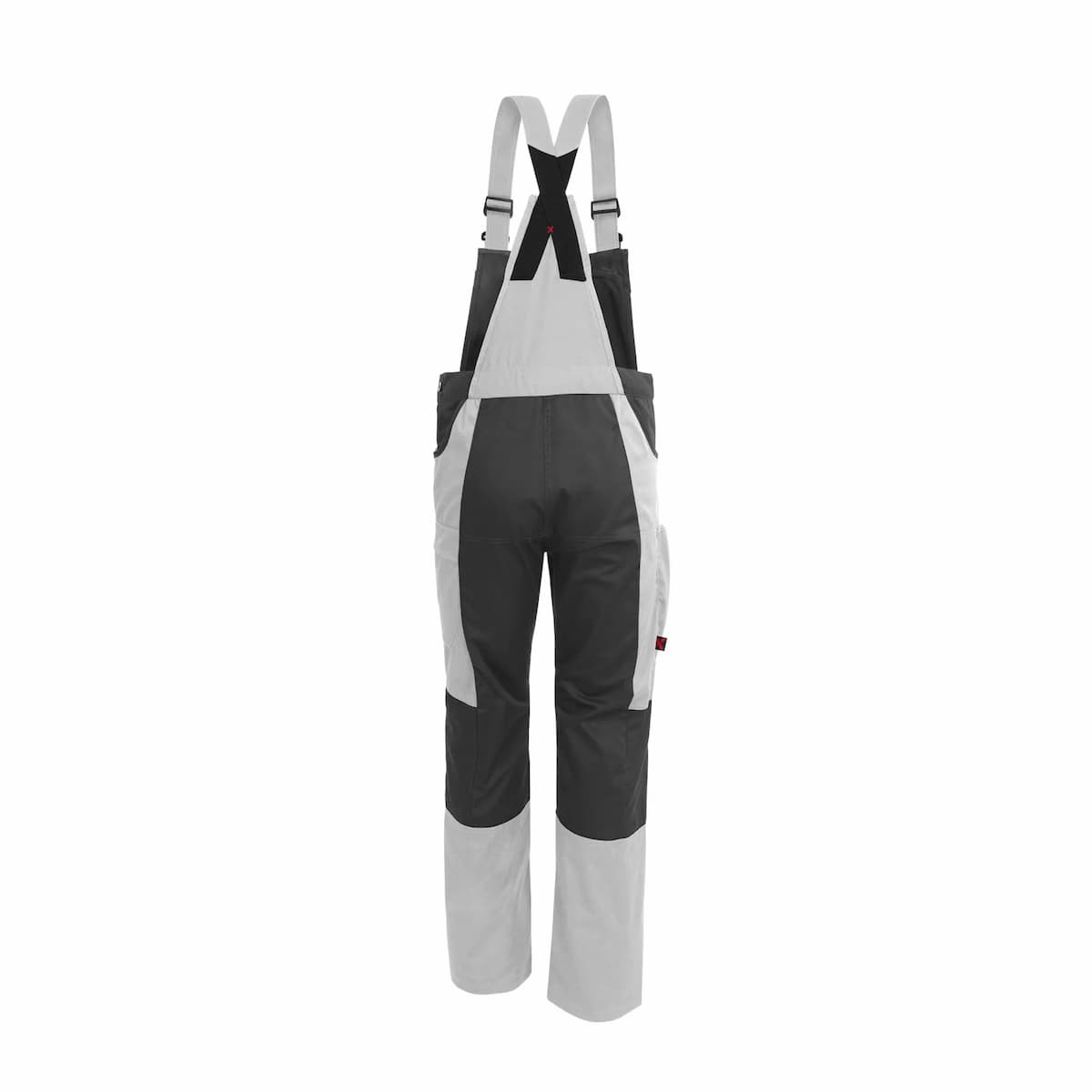 Single breast bib with attached bib pocket, closable with inside Kst zipper, additional separation for pen compartment on both sides, tool insert on the right and under left shoulder strap pocket, fabric shoulder strap with elastic intermediate secti...